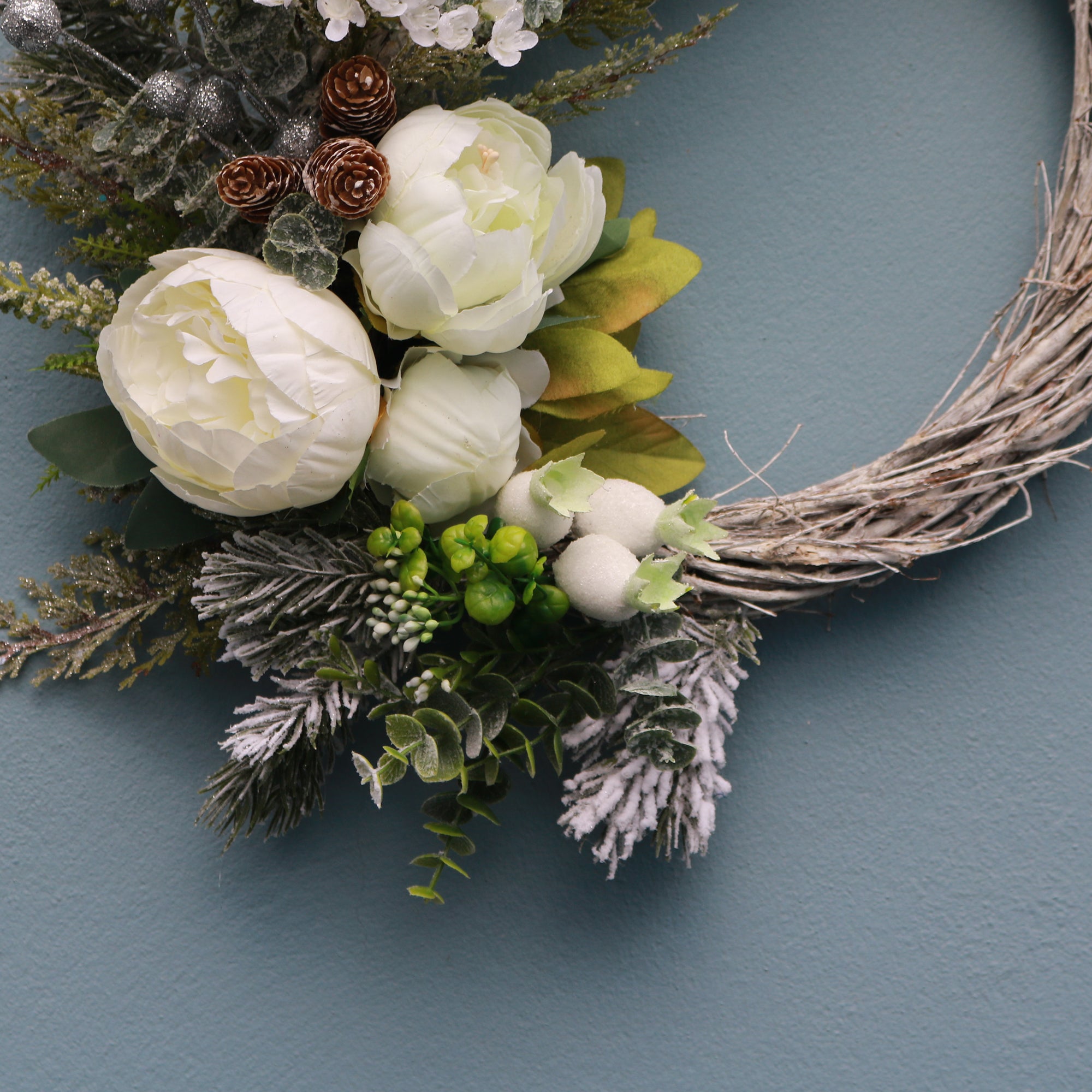 A best seller from last year is back again! White Indulgence is a beautiful but simple festive design. White peony roses with white rosehips are set against striking evergreen foliage and delicate silver accents.