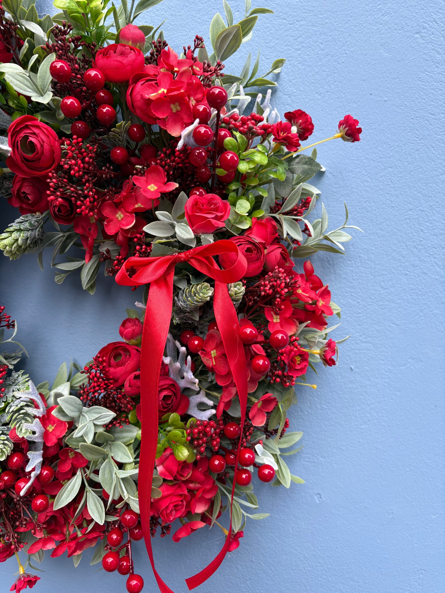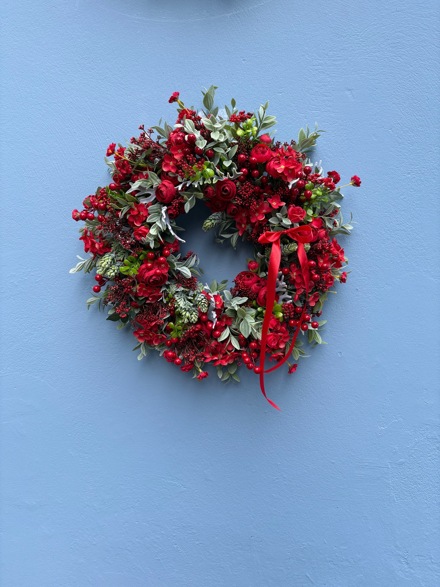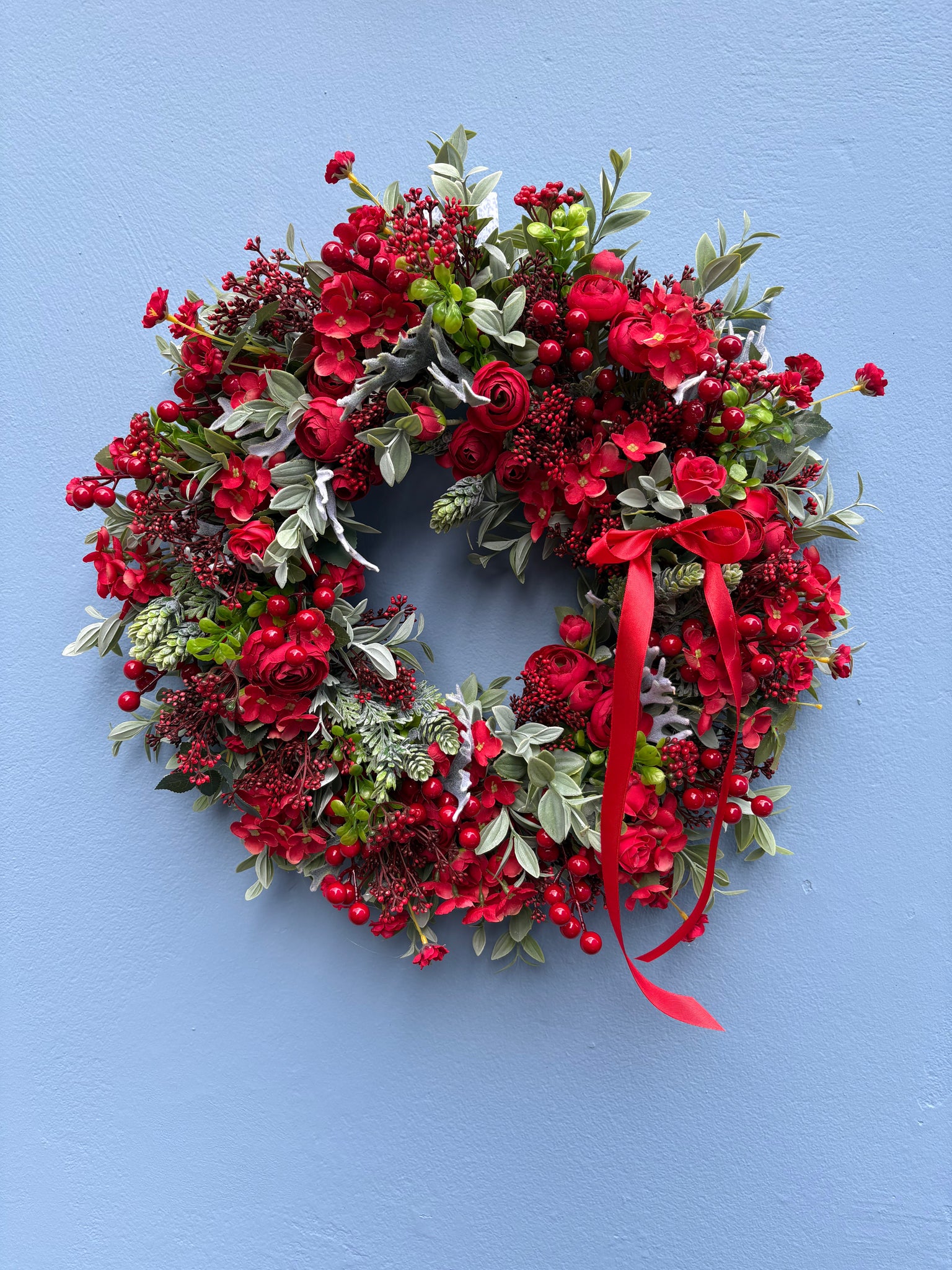 Gloria is our version of a traditional Christmas wreath with lots of Christmas foliage, red berries and loads of red flowers it’s finished with a little eucalyptus and a red bow. It only comes in two sizes medium & large