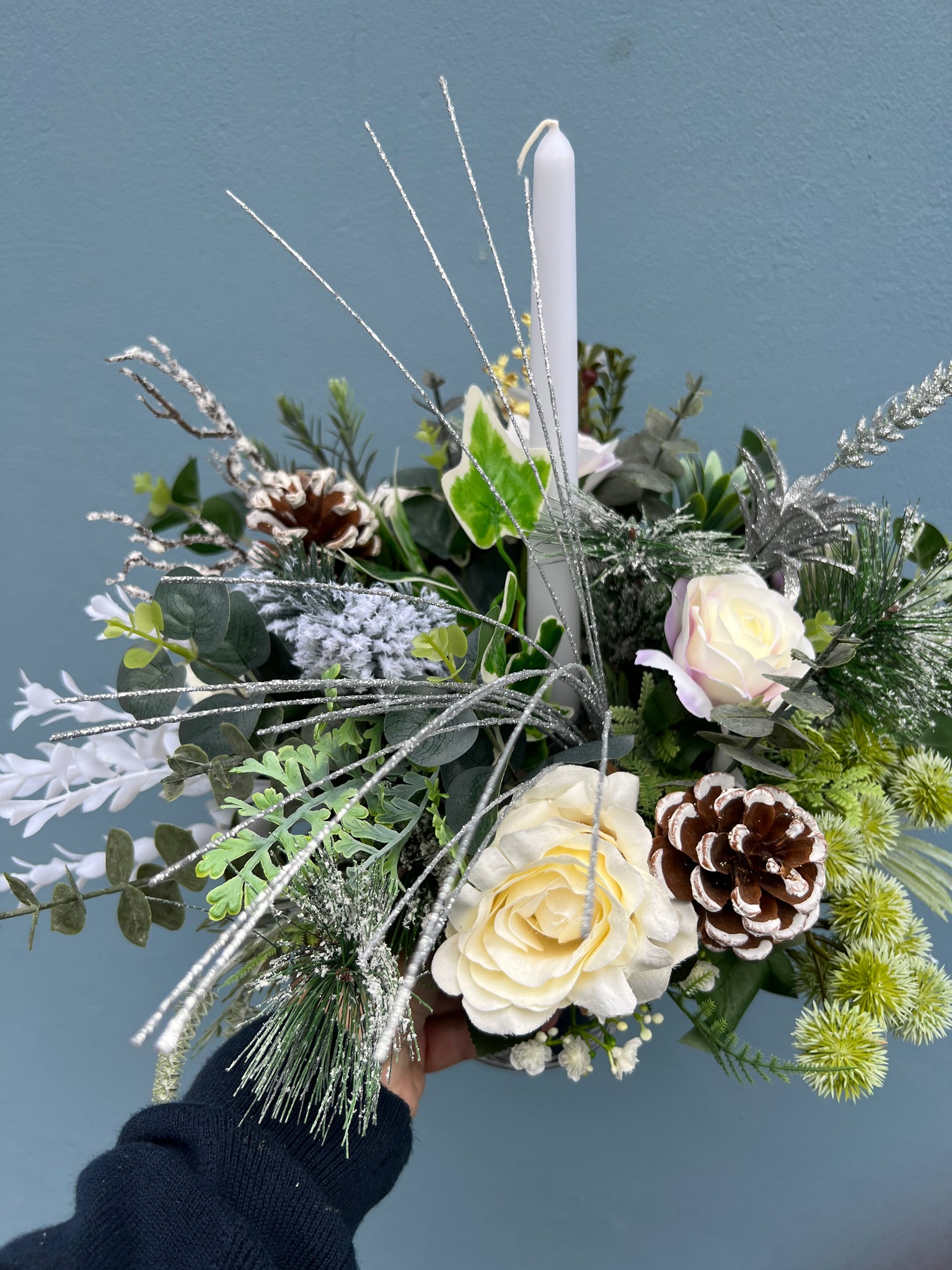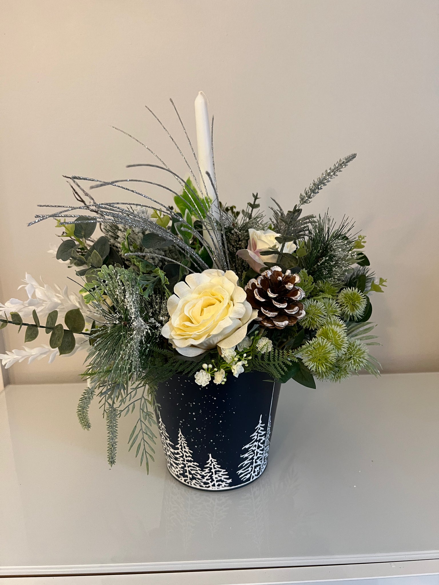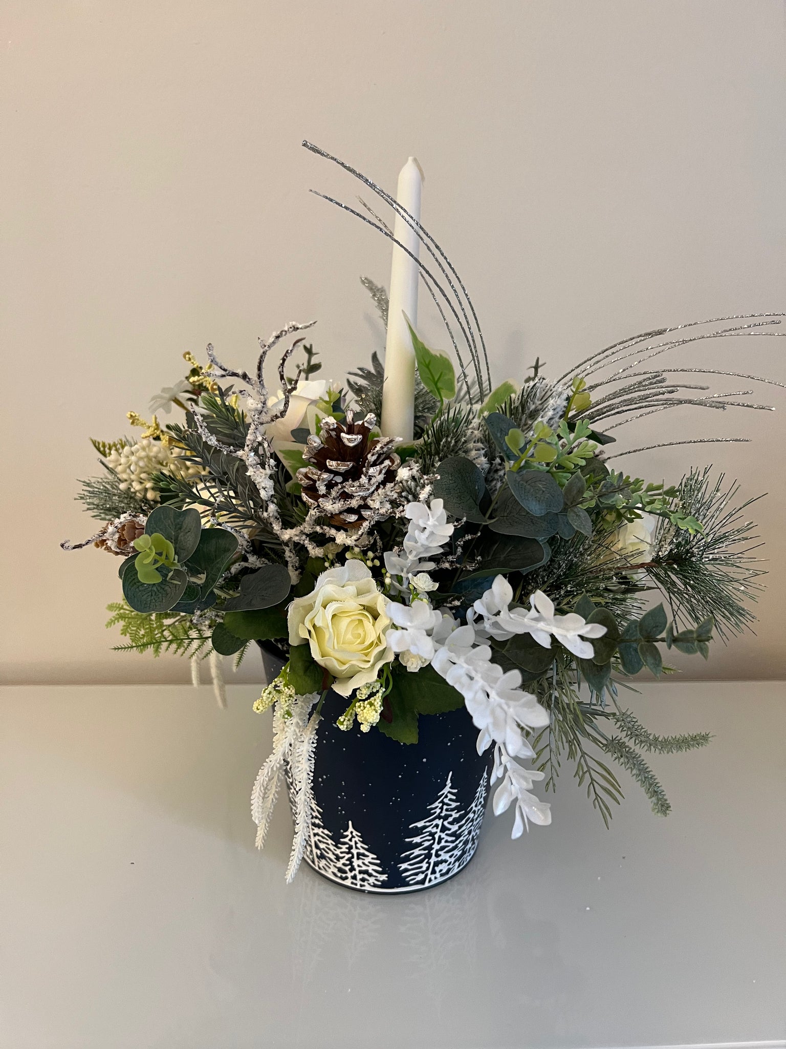 if you like navy and white then this is the Christmas arrangement for you, Vixen has roses and silver decorations like cones and berries, lots of frosted and hanging foliage in a navy blue pot with white Christmas trees with a white candle. these pots can be brought out every year for years to come.